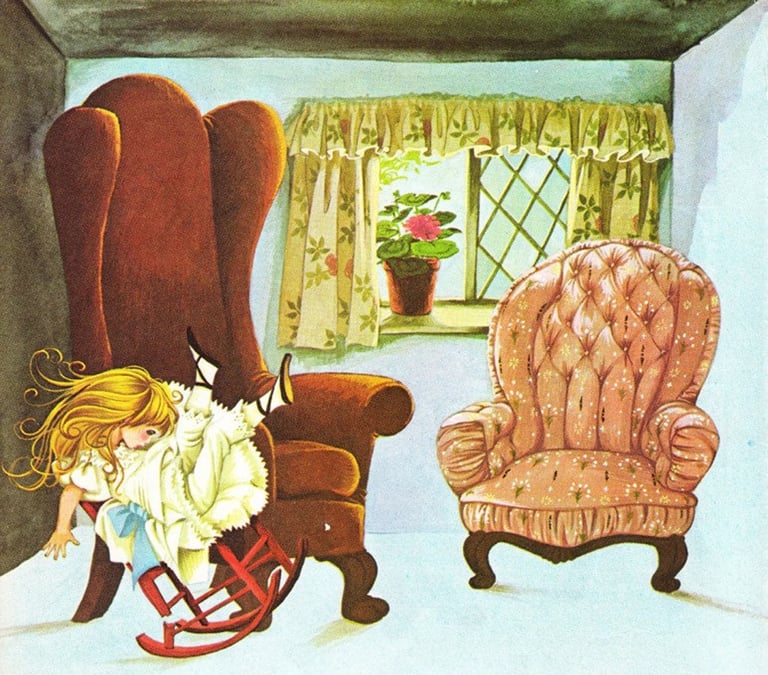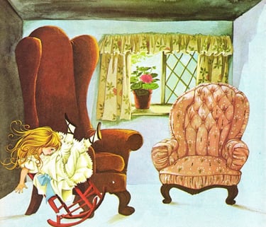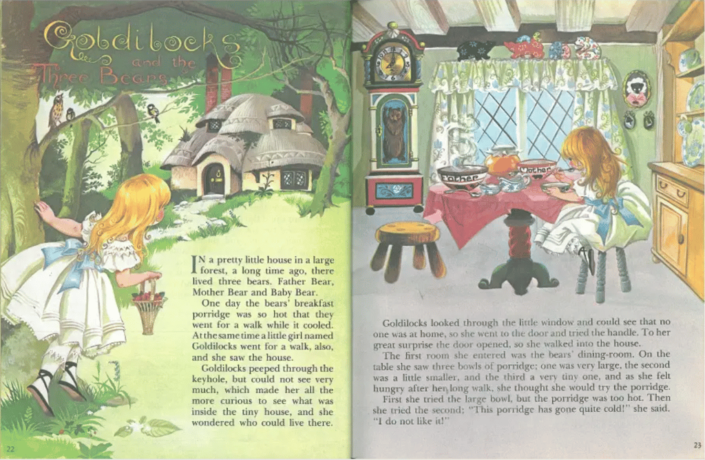 Janet et Anne Grahame-Johnstone, illustrations pour Goldilocks and the Three Bears (Boucle d'or et les trois ours), A Book of Fairy Tales (Livre de contes de fées), Dean, Dean and Son Ltd, London, England, 1977, p. 22-29.