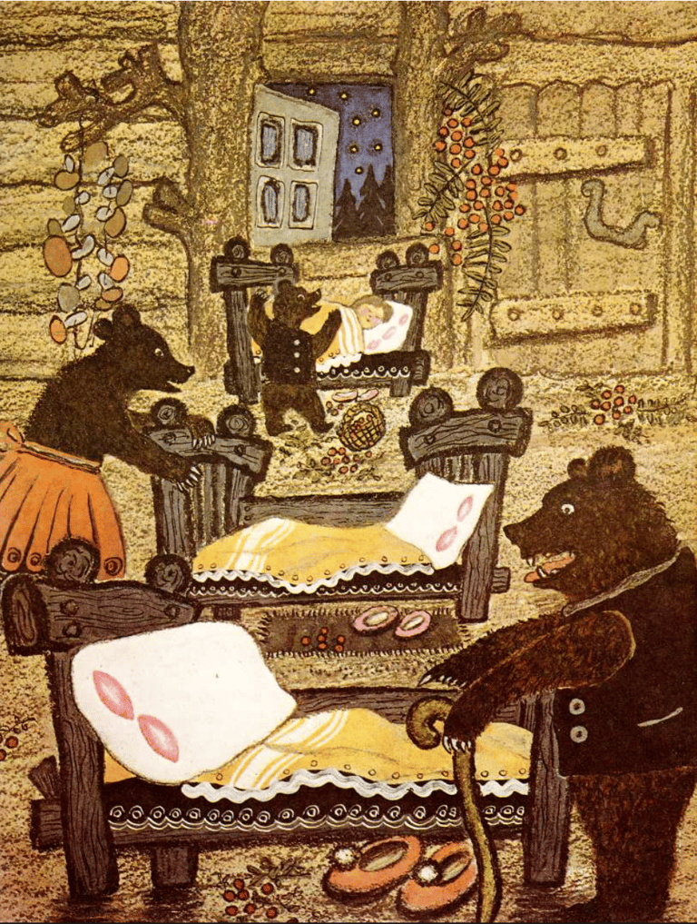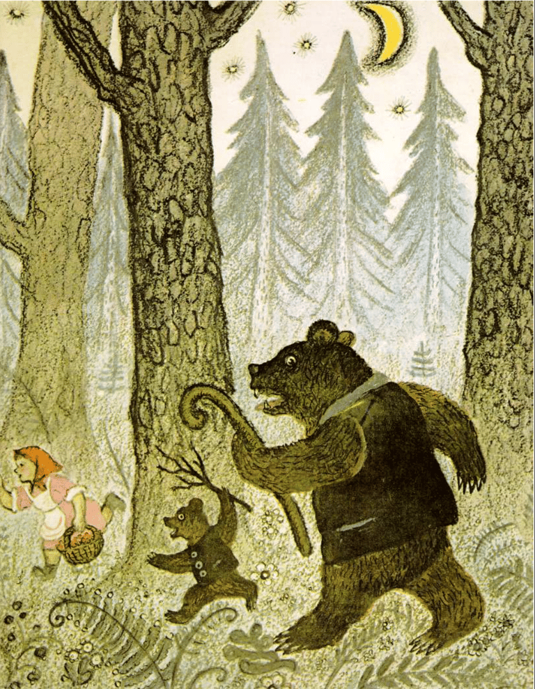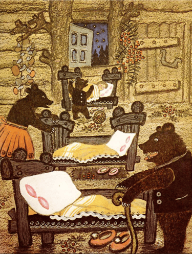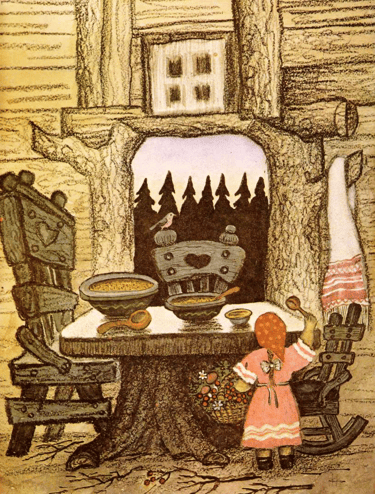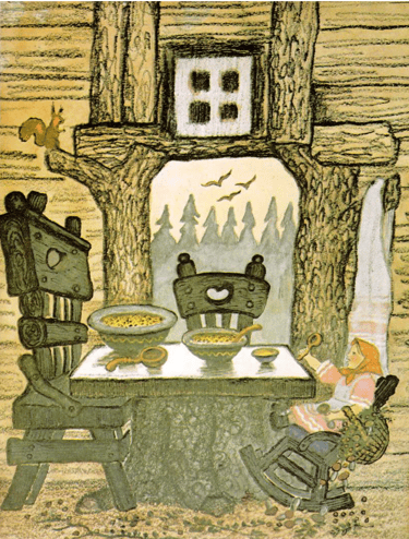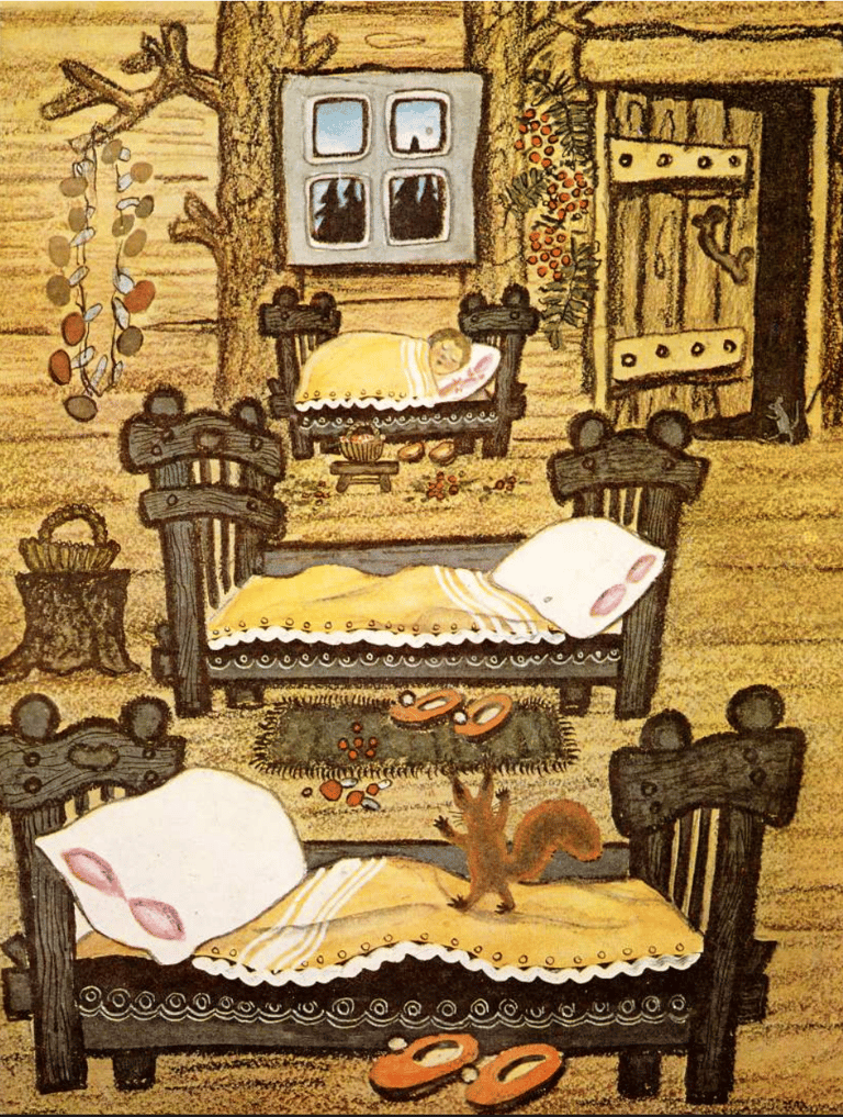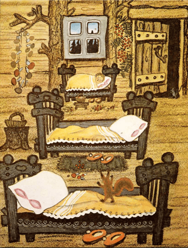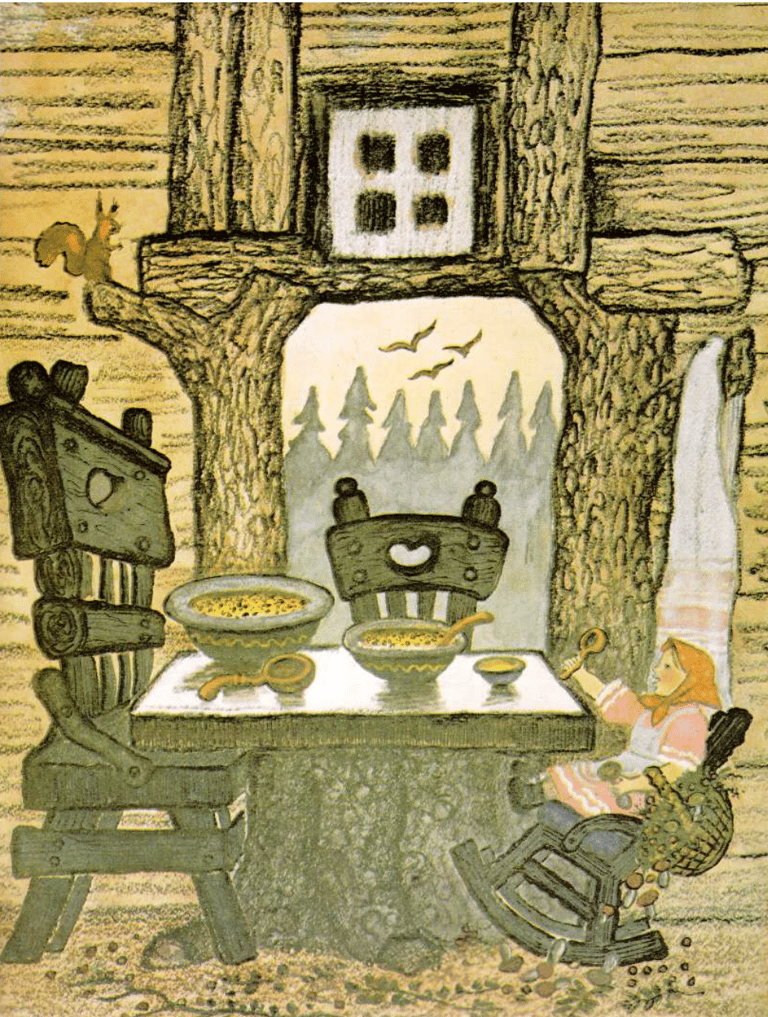 Yury Vasnetsov, illustrations pour Three Bears (Les Trois ours)(1935) de Lev Tolstoy, Raduga Publishers, Moscow, p. 4, 8, 10, 12, 16, 18.