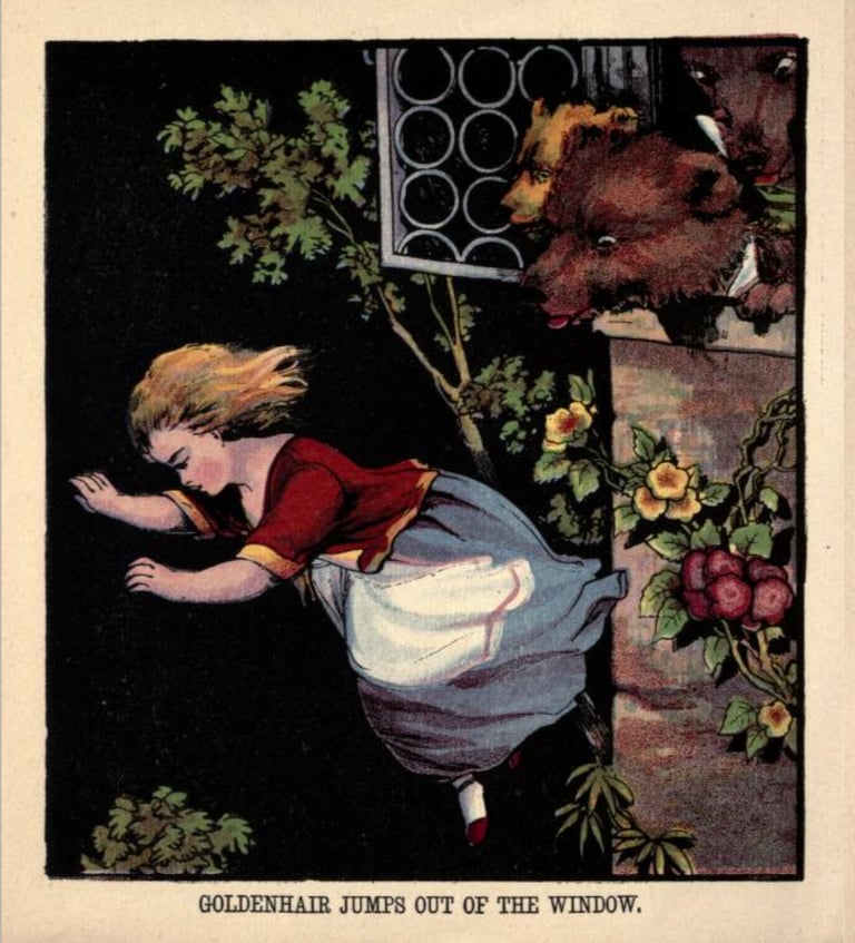 "Goldilocks runs from the three bears" ("Boucle d'or s'enfuit de la maison des trois ours")
