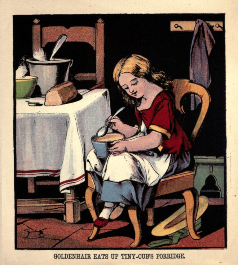 Leonard Leslie Brooke, illustrations pour The Story of the Three Bears (L'histoire des trois ours)(190-?), Leslie Brooke's children's books, Frederick Warne & Co, London, New York, p. 8, 9, 11, 12, 21, 22.