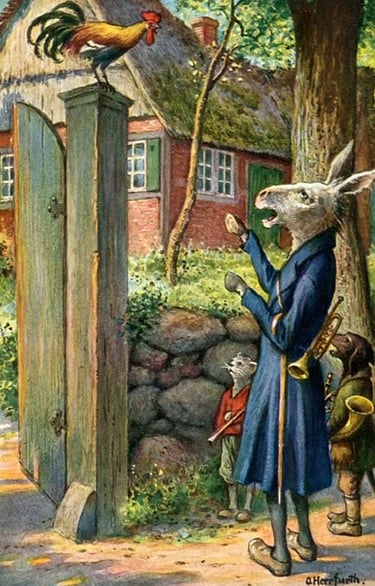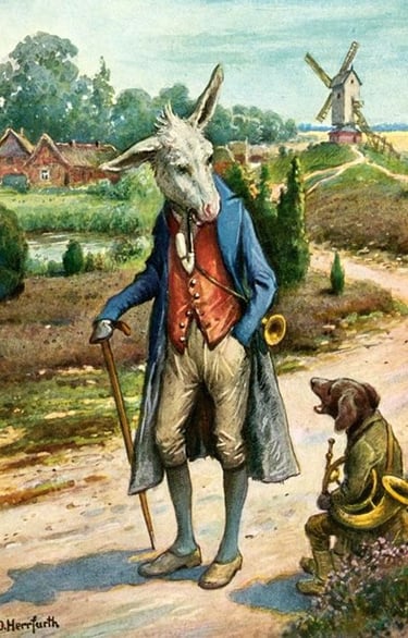 Oskar Herrfurth, illustrations pour Die Bremer Stadtmusikanten (Les Musiciens de Brême)(début du XXème siècle, date inconnue) de Jacob et Wilhelm Grimm, série de six cartes postales de la société Uvachrom, série 285, n°4695-4700.