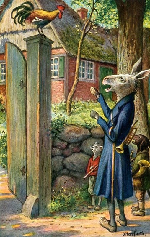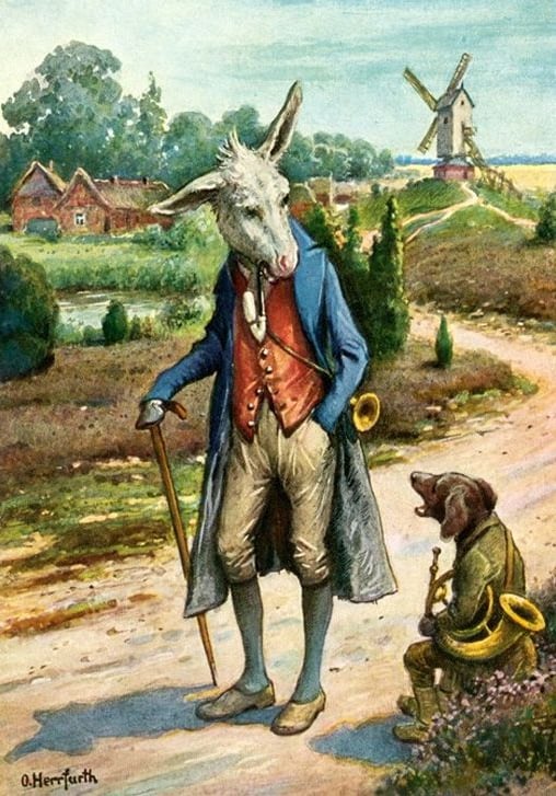 Otto Ubbelohde, illustration pour Die Bremer Stadtmusikanten (Les musiciens de la ville de Brême) de Jacob et Wilhelm Grimm (1909) dans Märchen aus aller Welt (Contes du monde entier), Digitale Bibliothek (bibliothèque numérique).