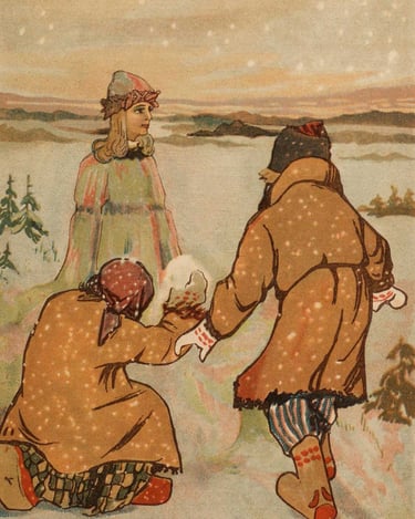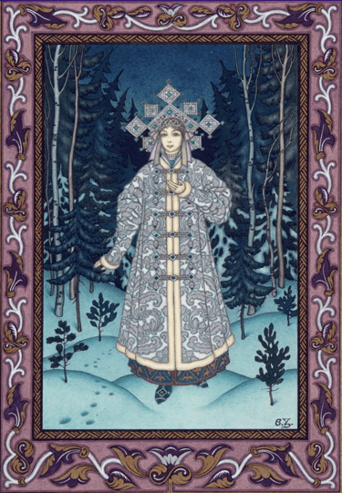 En Russie, l’enfant de neige est connue sous le nom de Snegourotchka. C’est une figure populaire. Elle est la fille (ou petite-fille) de Ded Moroz, le Père Gel, très souvent comparé au Père Noël occidental, et de Vesna, la déesse slave du printemps.