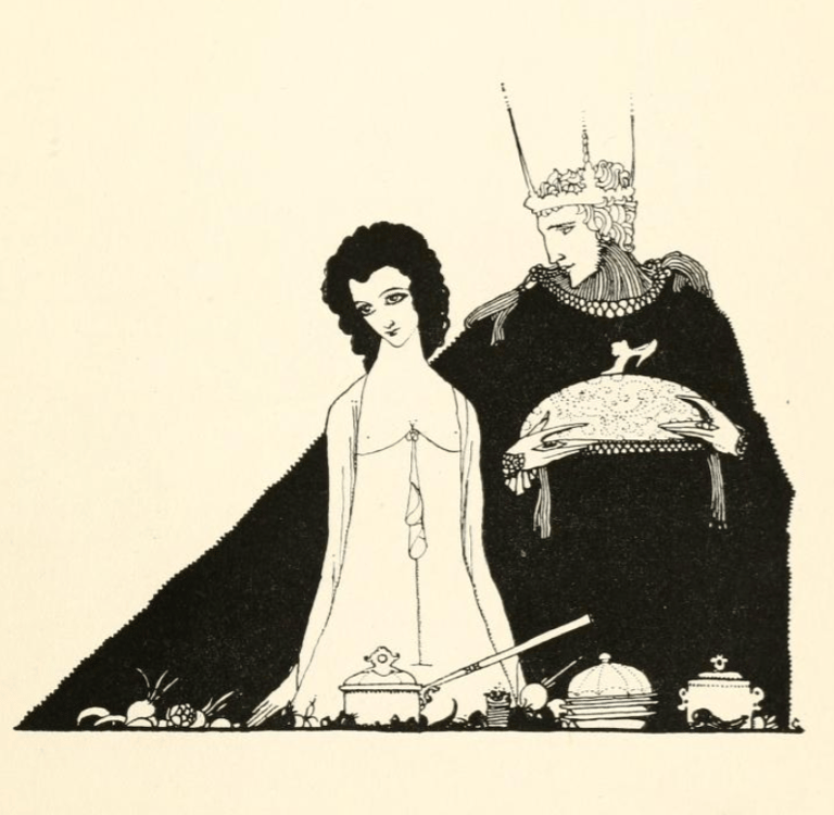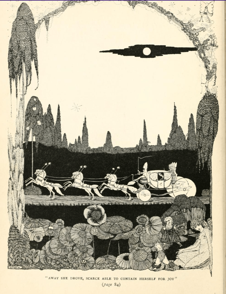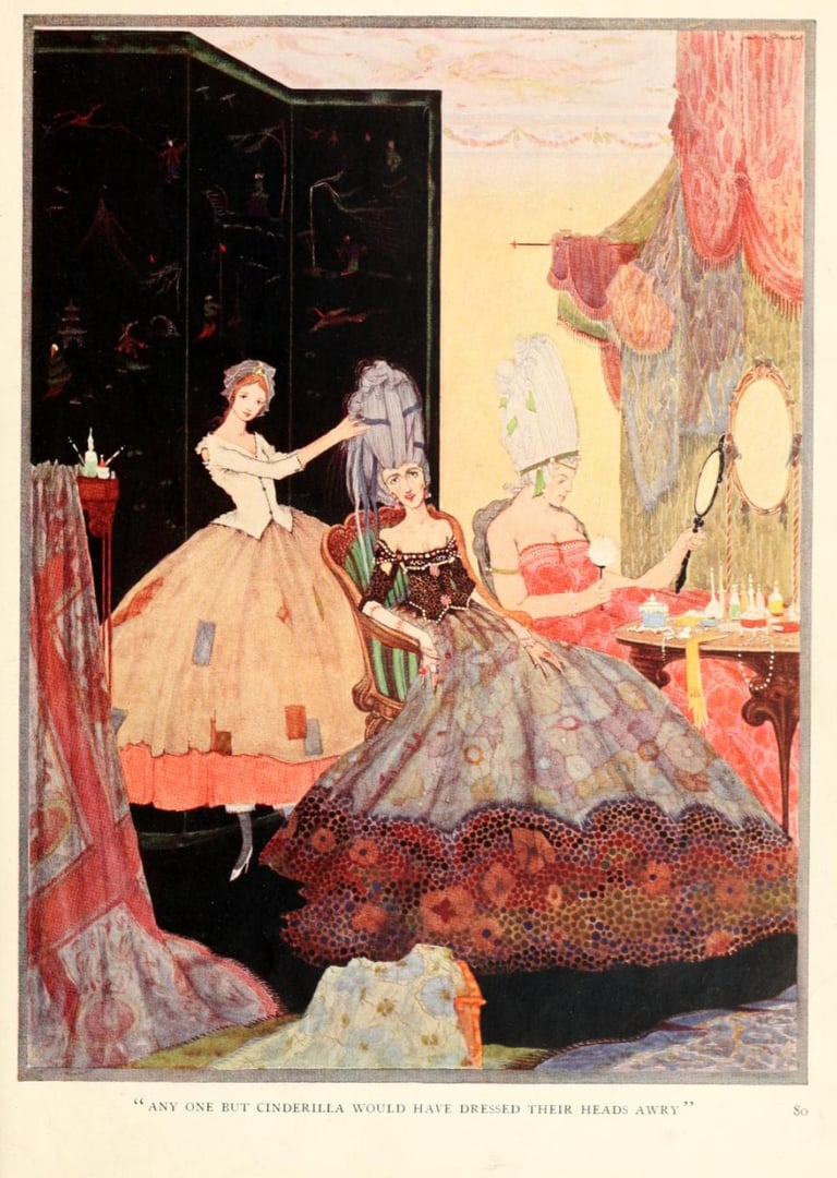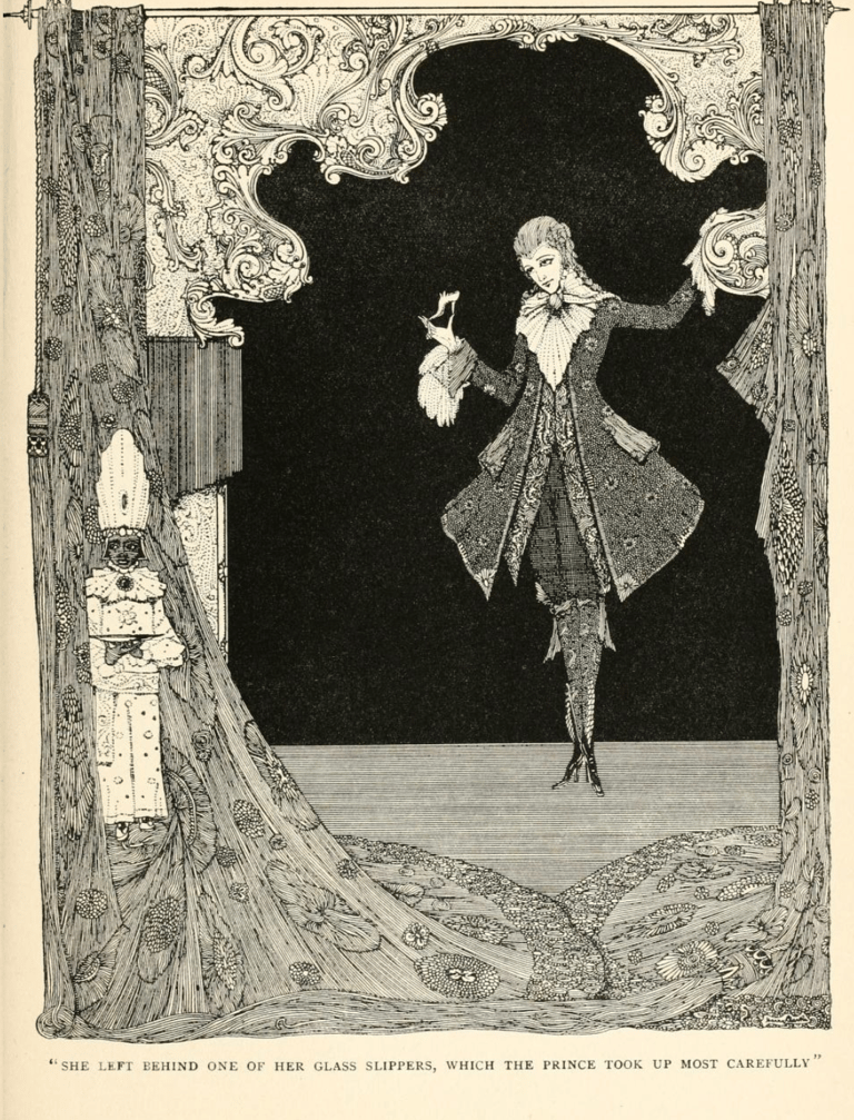 Harry Clark, illustrations pour Cinderilla ; or, The Little Glass Slipper (Cendrillon ou la petite pantoufle de verre) dans The fairy tales of Charles Perrault (Contes de Charles Perrault)(1922), London : Harrap, p. 77, 78, 81, 87.