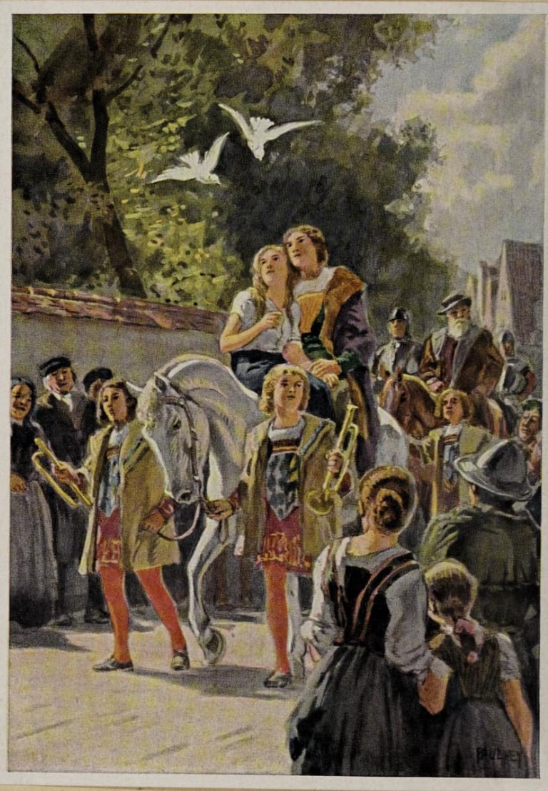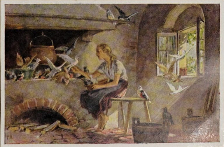 Paul Hey, illustrations pour Aschenputtel (Cendrillon) de Jacob et Wilhelm Grimm (1939), Deutsche Märchen (Contes allemands), Paul Alverdes, Hambourg, Cigaretten-Bilderdienst, p. 45-47.