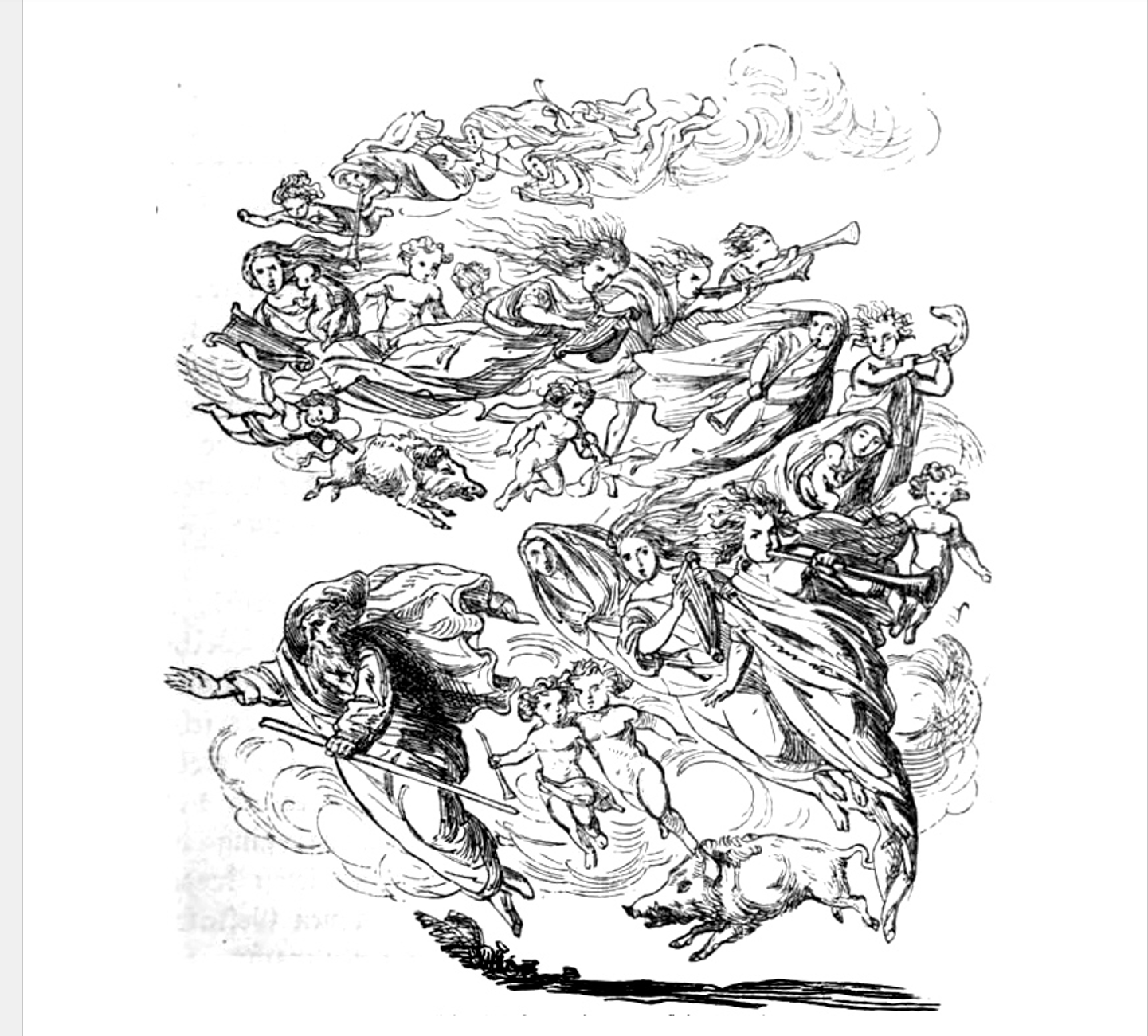 Frau Holle oder Perchta : die wilde Jagd (Dame Holle, ou Perchta : la chasse sauvage) dans Das festliche Jahr in Sitten, Gebräuchen und Festen der germanischen Völker d'Otto von Reinsberg-Düringsfeld, Leipzig : Spamer, Bayerische Staatsbibliothek (bibliothèque d'État de Bavière), Munich, Allemagne, 1863, p. IX.