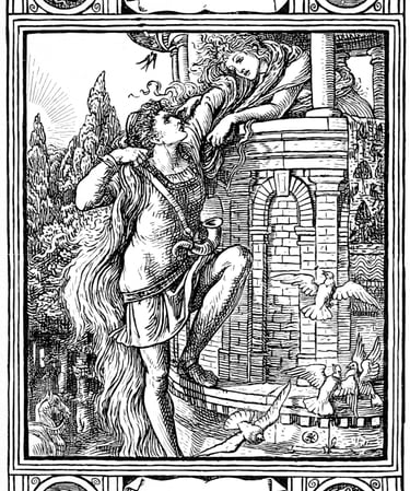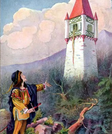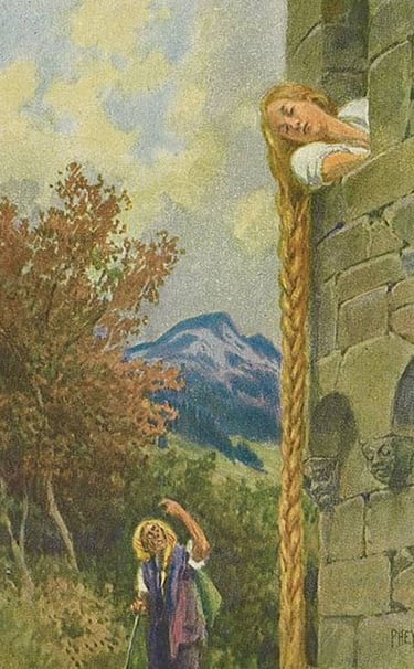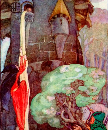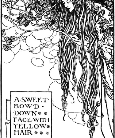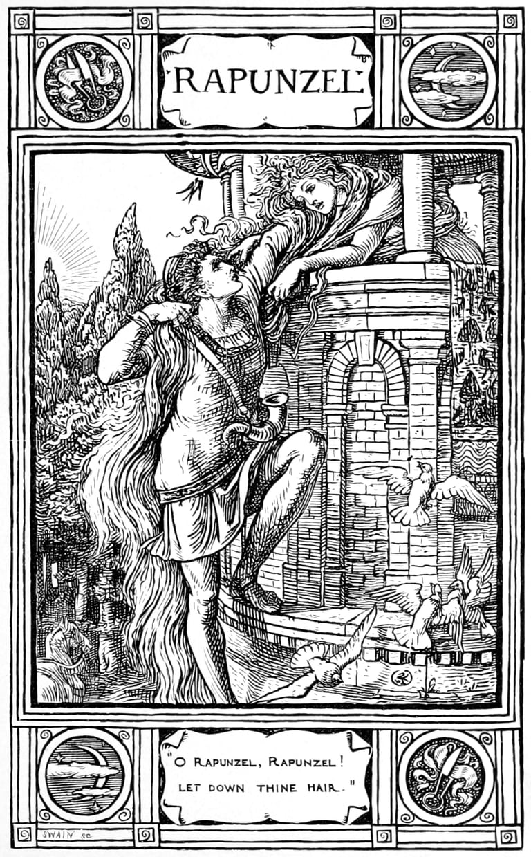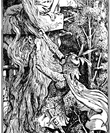 Walter Crane, illustration pour The Robber Bridegroom (Le fiancé brigand)(1914) dans Children’s and Household Tales collected by the brothers Grimm (Contes de l’enfance et du foyer collectés par les frères Grimm), trad. Lucy Crane, Coll. Bros, Macmillan & Co Guildford Scientific Press, Lord Henfield, 2022, p. 23.