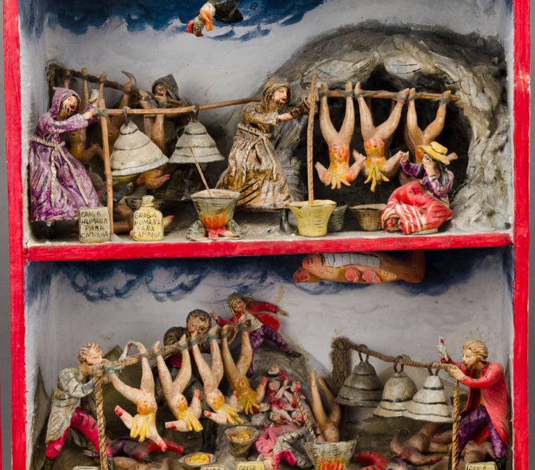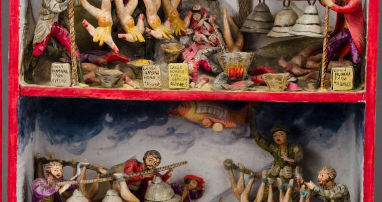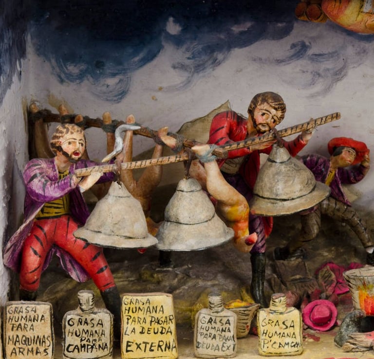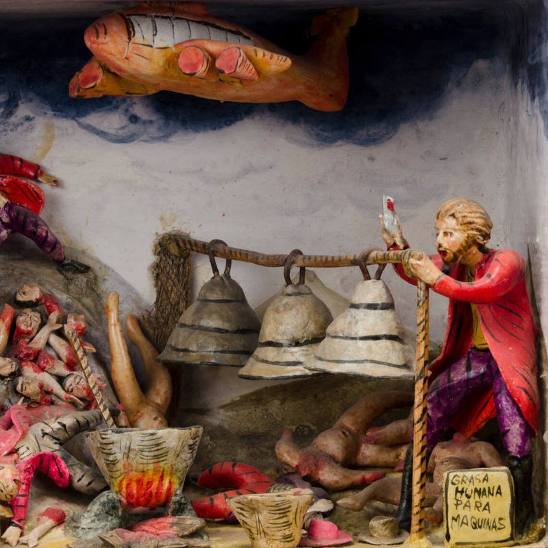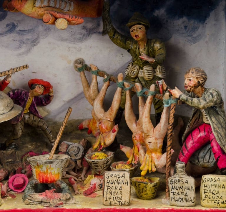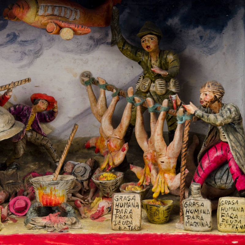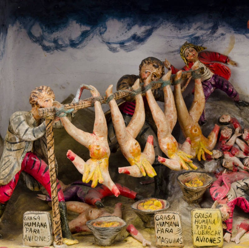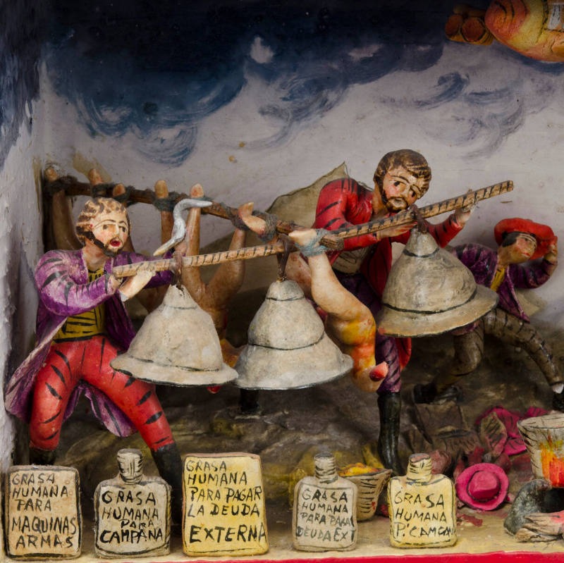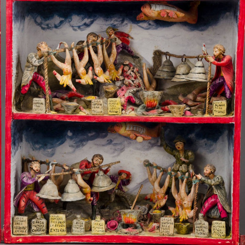 « Les portes intérieures et extérieures du coffret sont ornées d’un motif floral peint en marron, rose et jaune. Les bords du coffret sont soulignés d’une bordure rouge. L’intérieur comporte trois étagères. Le premier niveau représente la période coloniale ; le deuxième illustre l’ère industrielle moderne ; et le niveau inférieur correspond à l’époque contemporaine. Le niveau supérieur, ou premier niveau, montre trois moines en train de faire bouillir de la graisse humaine pour en faire de l’huile. Les corps humains décapités sont suspendus la tête en bas. On y trouve des bocaux portant des étiquettes indiquant « Grasa Humana Para Campanas ». De plus, plusieurs cloches sont suspendues au-dessus des bocaux. Une femme, au premier plan à gauche, observe la scène avec horreur. Elle est vêtue d’un costume paysan traditionnel. Un condor surplombe la scène. Le niveau intermédiaire représente une scène similaire. Les trois personnages sont vêtus de vêtements plus modernes. Les corps nus décapités sont à nouveau présents dans la scène. Les bocaux destinés à la graisse portent des étiquettes différentes indiquant que la graisse humaine sert à lubrifier des machines et des avions. Les têtes sont visibles à l'arrière, sur le sol. Plusieurs personnages indigènes sont allongés sur le sol. Au lieu d’un condor en haut, on voit un avion. Le niveau le plus bas montre une autre scène similaire. Cette fois, les étiquettes sur les bocaux indiquent que la graisse humaine sert à financer l’armée, à rembourser la dette extérieure, etc. Toutes les étiquettes sont en espagnol. On y voit à nouveau des clochettes, des corps décapités, etc. »