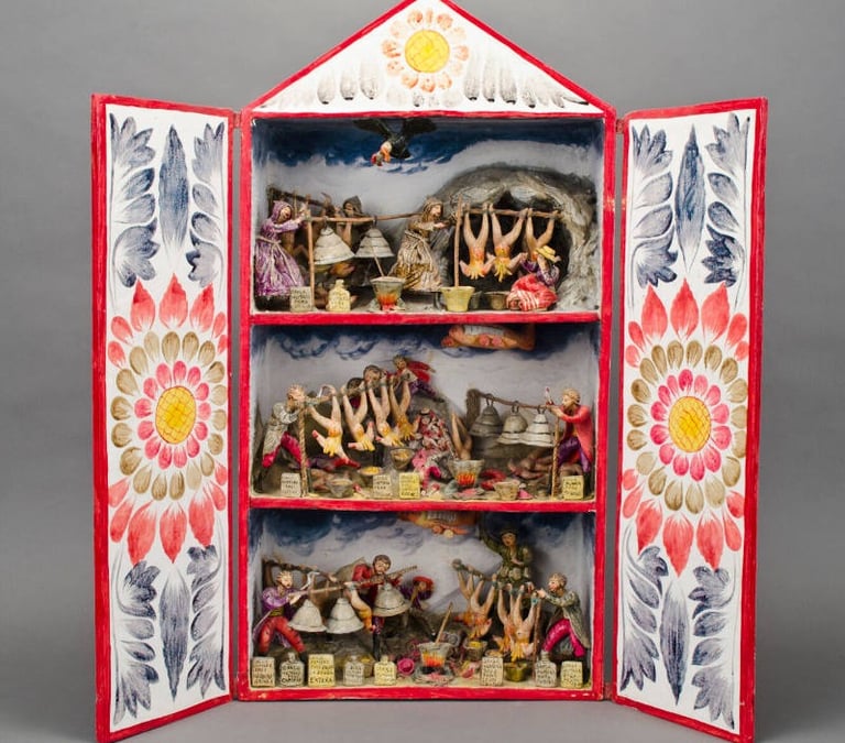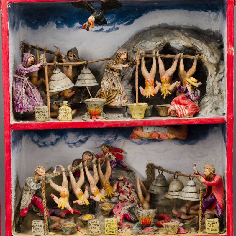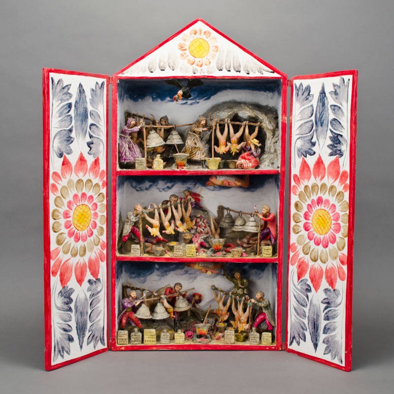Nicario Jiménez Quispe, El Pistaku (1987), bois, gesso, fécule de pomme de terre, pigments, peinture, coffret en contreplaqué à deux portes, 71,7551 × 76,2002 × 15,24 cm, Museum of International Folk Art, don de Linda R. James, Matthew B. James Ramirez et Jason D. James Ramirez