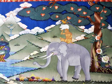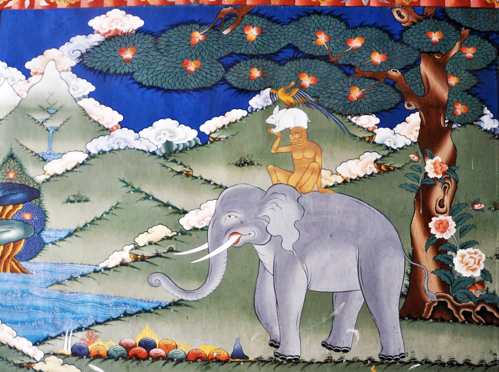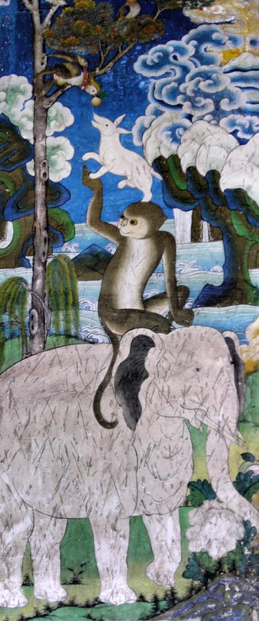 Thuenpa Puen Zhi (Quatre amis harmonieux), peinture murale, dzong de Punakha, Bhoutan