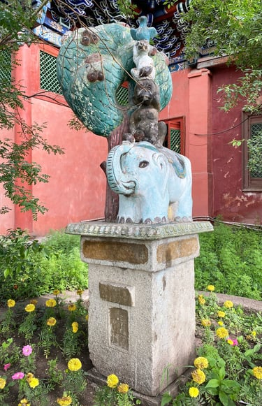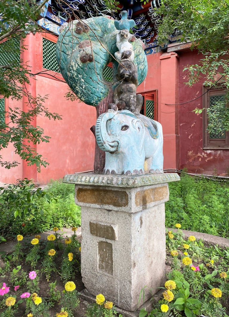 མཐུན་པ་སྤུན་བཞི། Les quatre animaux harmonieux, monastère de Gandantegchinlin, Oulan-Bator, Mongolie, photographie de Bernard Gagnon