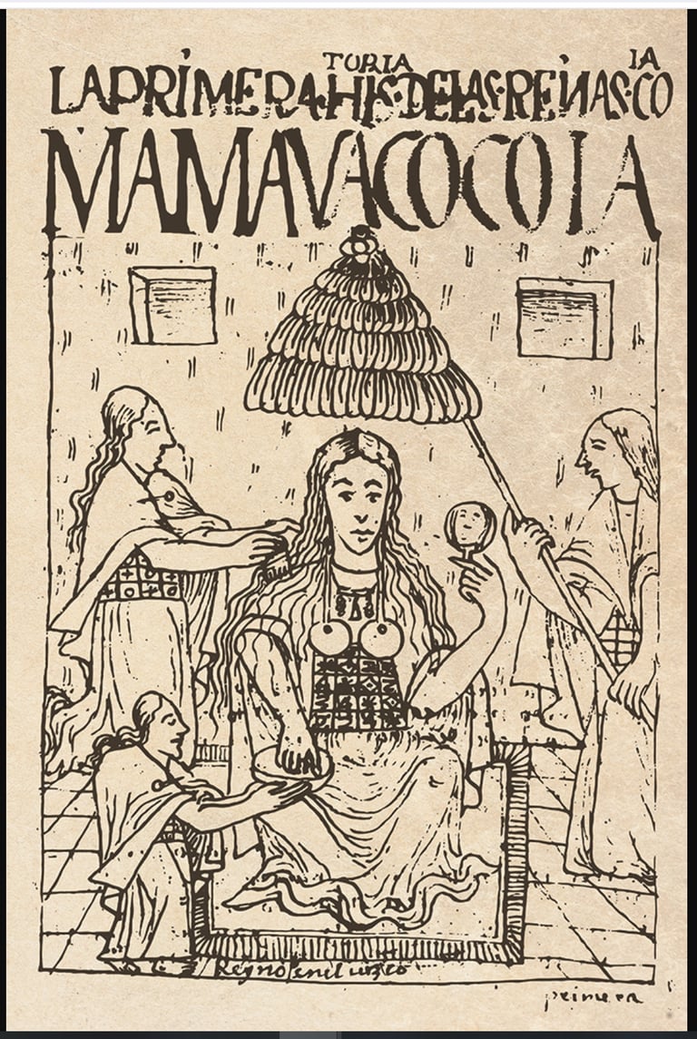 Felipe Guaman Poma de Ayala, La primera historia de las reinas Coya Mama Huaco Coya (La première histoire des reines Coya Mama Huaco Coya) dans La Primera y Nueva Corónica y el buen Gobierno (La Première et Nouvelle Chronique et le Bon Gouvernement)(1615), Bibliothèque Royale de Copenhague, Danemark, p. 87.