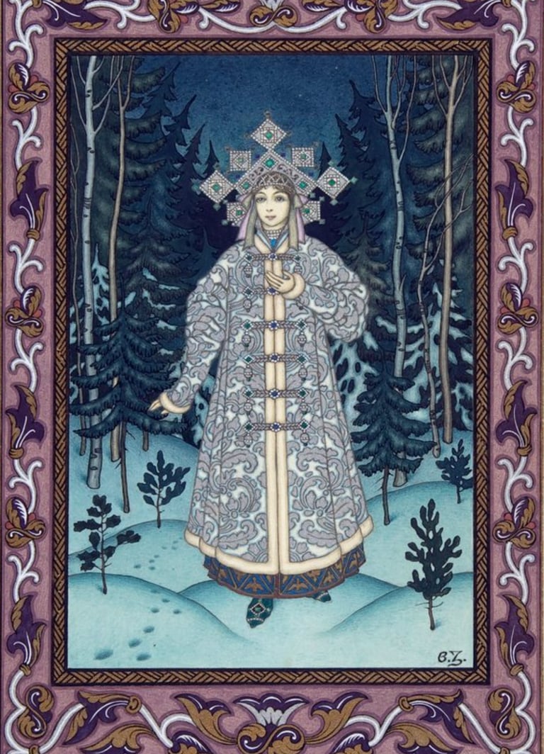 Boris Zvorykin, Snegurochka (La Fille des neiges), illustration pour Snegurochka dans L'Oiseau de Feu et d'autres contes populaires russes (1925), gouache, encres métalliques et encre noire sur graphite, 34, 7 x 26, 8 cm, Metropolitan Museum of Art, New York, Etats-Unis.