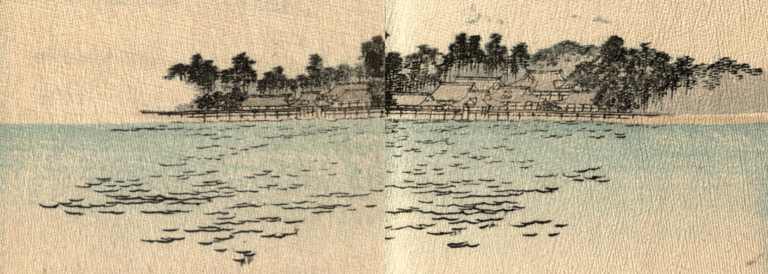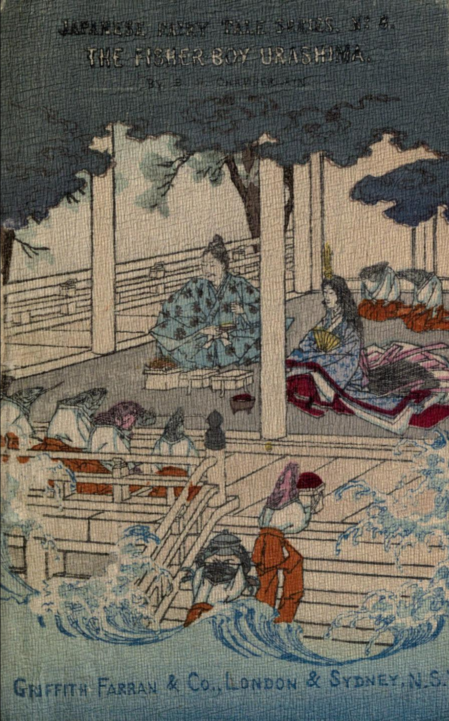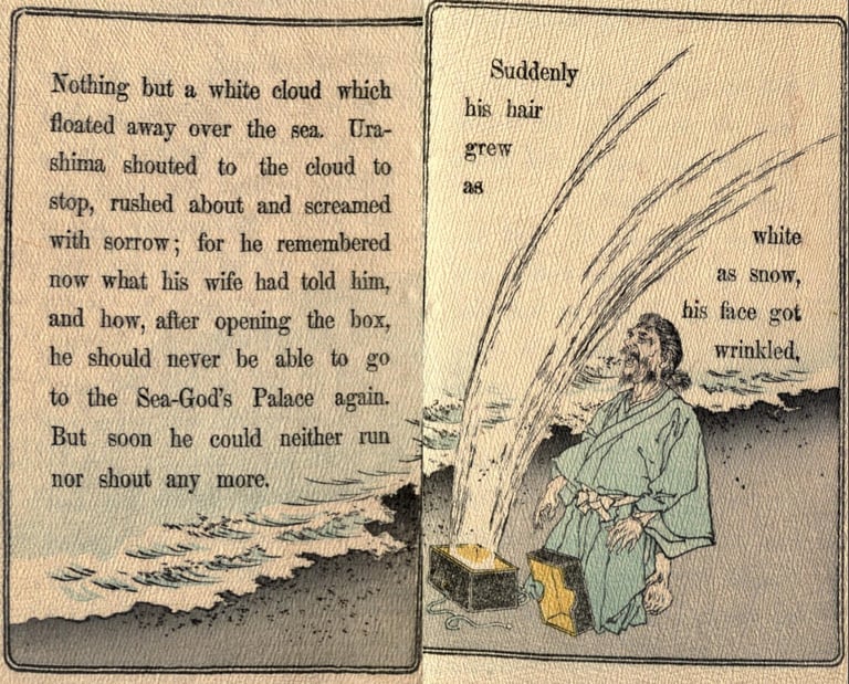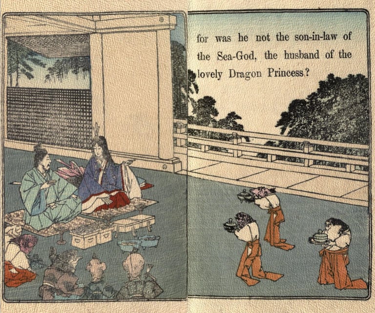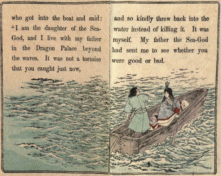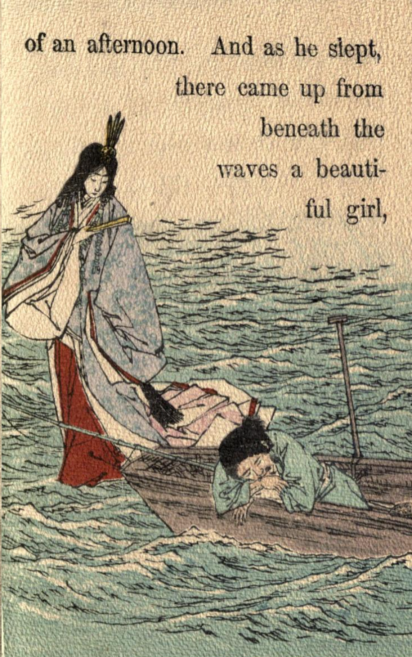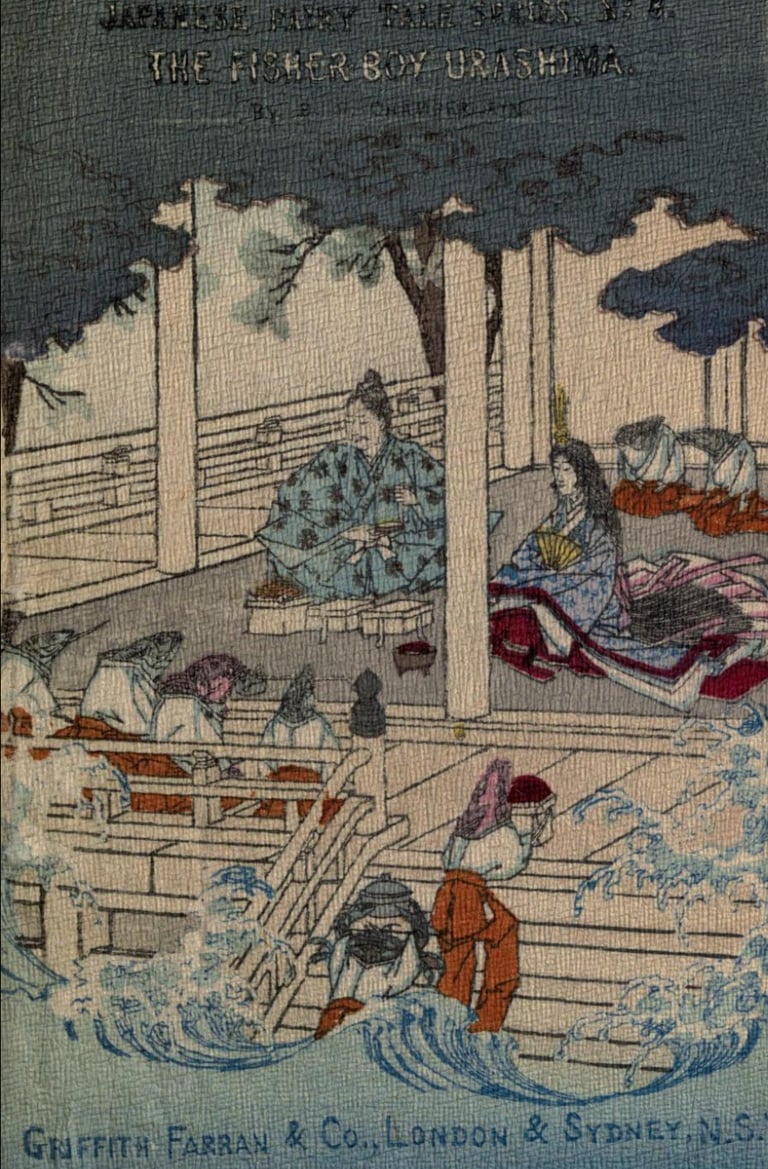 Illustrations pour The fisher-boy Urashima (Urashima, le jeune pêcheur)(entre 1892 et 1896 ?), trad. Basil Hall Chamberlain, University of California Libraries, London : Griffith, Farran & Co. ; Sidney, Ex libris Olive Percival, Japanese fairy tale Collection (Collection de contes japonais), n°8, p. 4, 7, 8, 9, 14, 15, 24, 25.